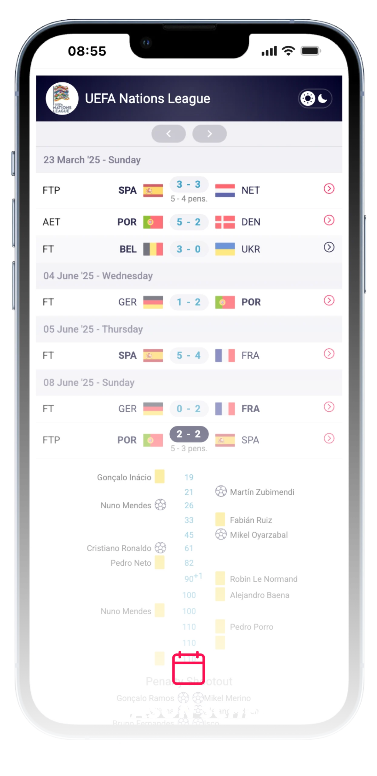 Use live scores, events, line-ups, standings, and player stats in minutes.
